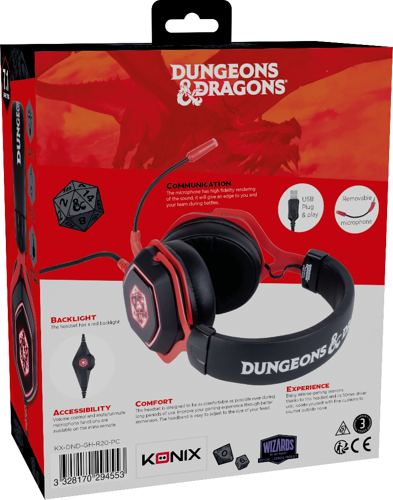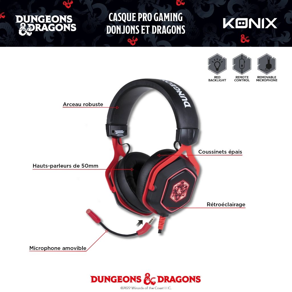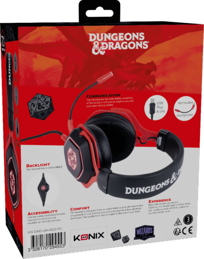 RÉTRO-ÉCLAIRAGE : Le casque dispose d’un rétro-éclairage rouge au design sobre et épuré. Il s’allume automatiquement en le branchant via prise USB.Lancez-les dès et rejoignez le monde incontournable de Dungeons et Dragons !